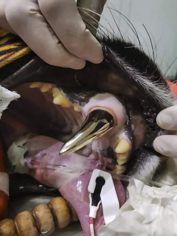 рачи помогли большой кошке справиться со стоматологической проблемой.