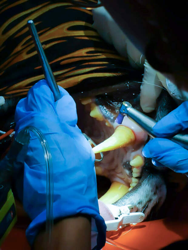 6. В течение трёх недель Кара придерживалась специальной диеты, после чего перешла на свой обычный рацион — благодаря коронке она вновь может есть мясо и разгрызать кости. По наблюдению зоологов, Кара часто «улыбается», демонстрируя золотой зуб.